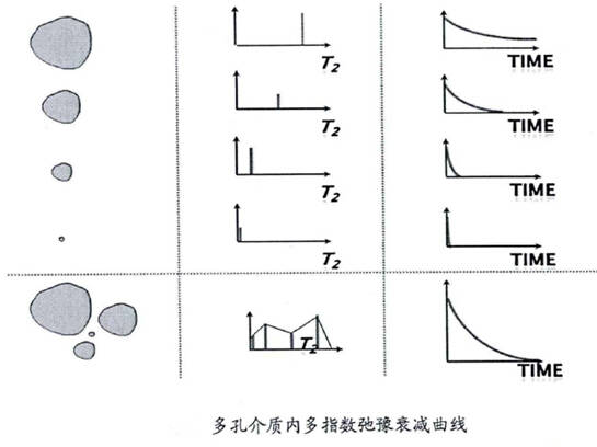 低场核磁共振技术利用油气或者水中的氢原子核在磁场中具有共振并能产生信号的特性来探测油、气、水及其分布和岩石物性参数。岩石中,不同大小的孔隙喉道构成岩石孔隙,弛豫时间显示的是孔隙大小的特征。因此T2谱显示了岩石的孔径大小分布,孔隙的尺寸越大,对应的弛豫时间越长,T2分布曲线越靠右侧;孔隙尺寸越小,对应的弛豫时间越短,T2分布曲线越靠近左侧。